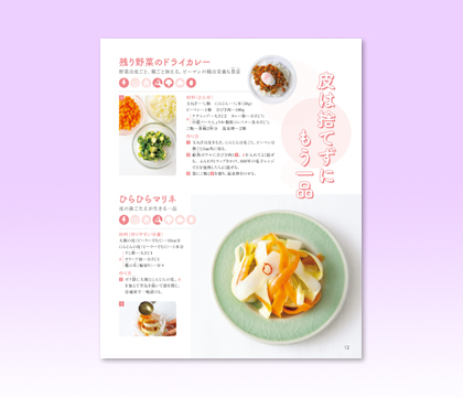 食品ロス削減アドバイザーでもある料理研究家・島本美由紀さんの簡単でエコなレシピの紹介です。「ニンジンと大根の皮やピーマンの種は美味しく食べられて、その方が栄養価も高いですよ」と島本先生。美味しいだけでなくゴミも減らせる工夫は、すぐに実践できるものばかりです。ブロッコリーを丸ごと使った炊き込みピラフや、ゆで時間1分のパスタなど目からうろこのレシピ9選。