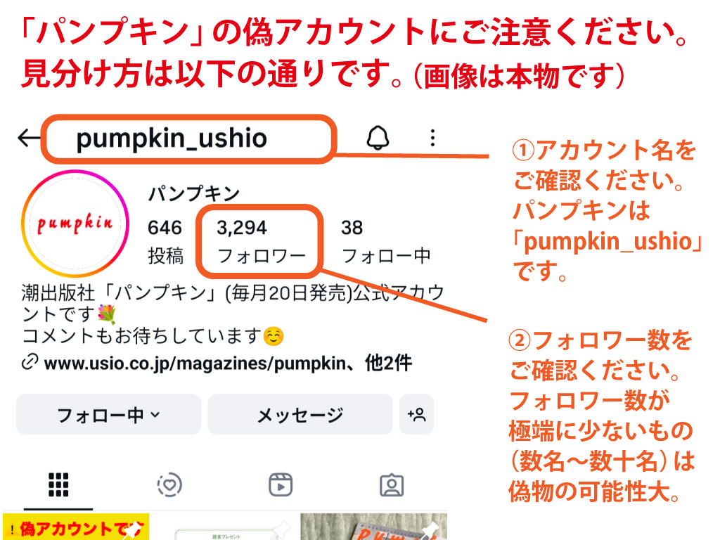 月刊「パンプキン」の偽アカウントが、いくつか発見されました。 また、今後 新たな偽アカウントが作成される危険性もございます。